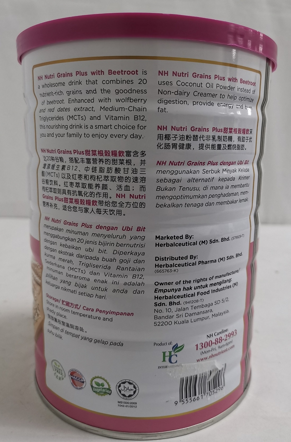 This lovely pink colour drink boasts of even greater health benefits with the added of wolfberry and red dates extract. NH Nutri Grains Plus Beetroot Ubi Bit 800g EXP102022 Campuran Bijirin Segera. The new NH Nutri Grains with Beetroot is also come in a smaller pack size.