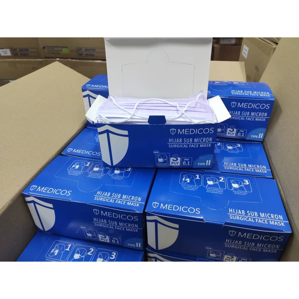 COMBO DEALS Medicos Surgical Face Mask Headloop Hijab 3ply Type. Mask 63079090 90189099 f. Each mask costs between RM22 and RM34 each.